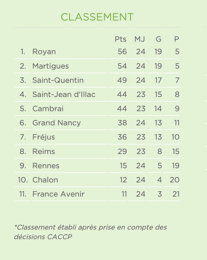 Même un calendrier un tantinet plus compliqué côté Royan – trois matches à domicile contre Fréjus, Saint-Quentin et Nancy, contre quatre pour les Avatiques (Chalon, Reims, Illac et France Avenir, avec deux confrontations face aux deux derniers pour conclure la saison) – n’altère l’enthousiasme royanais. « On est devant encore une fois, à nous de gagner nos matches et on restera devant. »