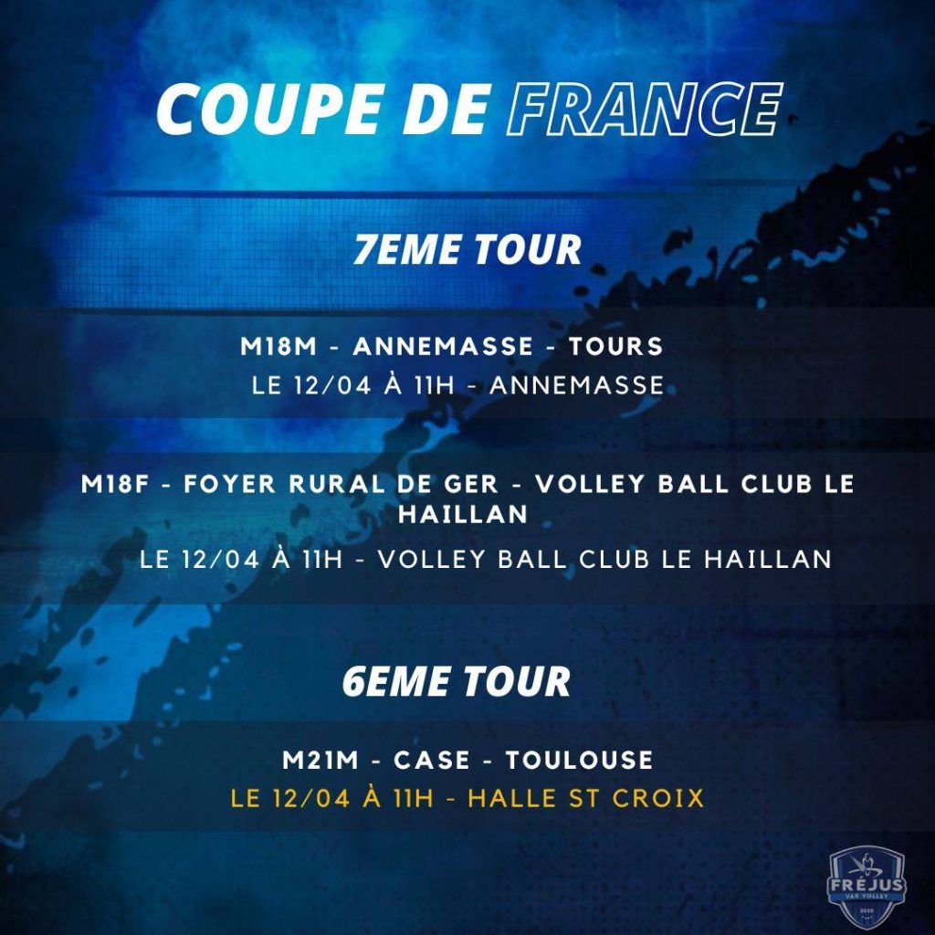 Place à la Coupe de France des catégories jeunes en cette fin de semaine, qui concernera trois équipes du Fréjus Var Volley (M21 masculins, M18 garçons et filles), nonobstant les M15 garçons qui, eux, ont déjà leur billet en poche pour les phases finales.